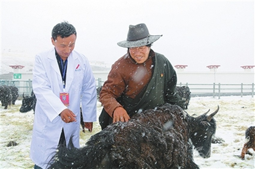 5月8日,甘孜縣達(dá)通瑪片區(qū)大雪飛揚(yáng)。在茶扎鄉(xiāng)銀多村集體牧場,放養(yǎng)人員格絨正在給上百頭牦牛喂草料,他喜滋滋地說,通過牧民儲備和農(nóng)牧農(nóng)村局提供草料的方式,牦??梢园踩^冬。銀多村現(xiàn)代化集體牧場合作社成立一年多的時間,共出欄牦牛16頭,總收益67380元,除去20%預(yù)留金,村民有了一定的收入,而作為放牧人員,他管理了52頭牦牛,一年有1.2萬元的收入。