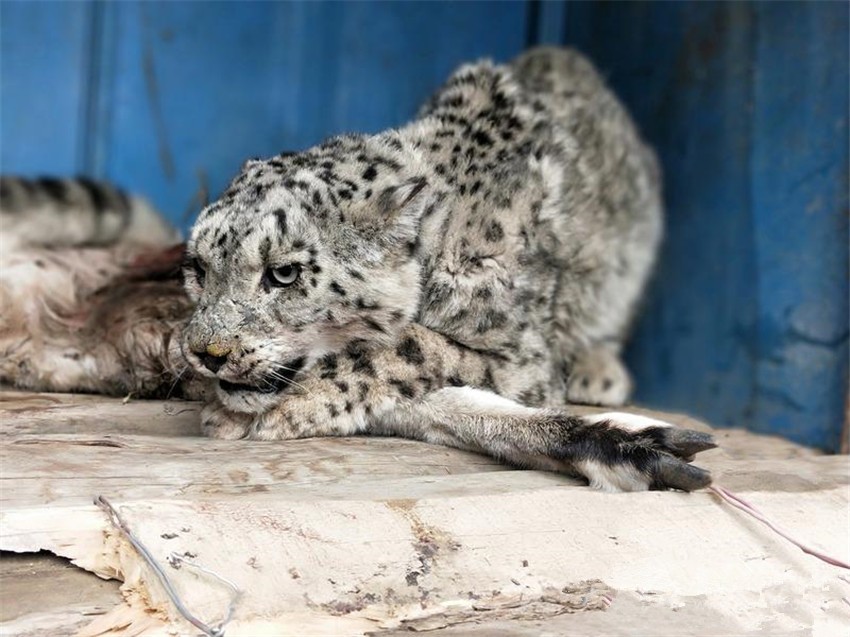 不放心受傷雪豹的隊(duì)員們隨即將發(fā)現(xiàn)的情況按屬地管理原則上報(bào)了該鄉(xiāng)黨委政府,聯(lián)系了行業(yè)主管部門林草局,并上報(bào)縣委縣政府,縣委政府主要領(lǐng)導(dǎo)高度重視要求鄉(xiāng)黨委政府和林草局賡即組織人員再到現(xiàn)場(chǎng)附近搜尋受傷雪豹看是否需要救治。當(dāng)一行人再次來到現(xiàn)場(chǎng),發(fā)現(xiàn)受傷的雪豹可能由于舍不得“獵物”去而復(fù)返正趴在巖羊旁,也可能由于傷情見人前來并未離去。大家在簡(jiǎn)單商議后,決定先由獸醫(yī)為雪豹現(xiàn)場(chǎng)查驗(yàn)傷勢(shì)。為防止雪豹傷人,在大家的配合下做出必要的防護(hù)措施后,開始為雪豹查驗(yàn)傷勢(shì),經(jīng)查驗(yàn)發(fā)現(xiàn)該雪豹左前肢和左后肢均被咬傷,其中左前肢受貫穿性咬傷,傷勢(shì)較重,造成其無法行走,隨即大家決定將雪豹帶回救治。
