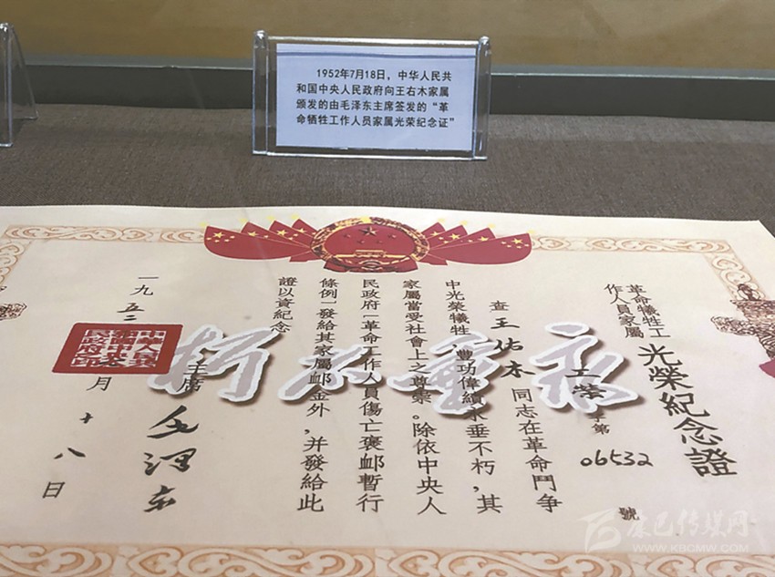 1952年7月18日,中華人民共和國(guó)中央人民政府向王右木家屬頒發(fā)的由毛澤東主席簽發(fā)的“革命犧牲工作人員家屬光榮紀(jì)念證”。 李睿 攝