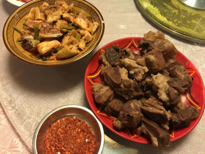 藏族同胞好將牛羊肉大塊入鍋大火煮之,剛過心則撈起。吃時(shí)手抓刀削入口,謂之手抓砣砣內(nèi)。冷熱食皆佳,肉嫩味鮮?,F(xiàn)在迎合大眾口味,有些用炒,有些用烤,蘸著海椒面,味道簡直美味極了。
